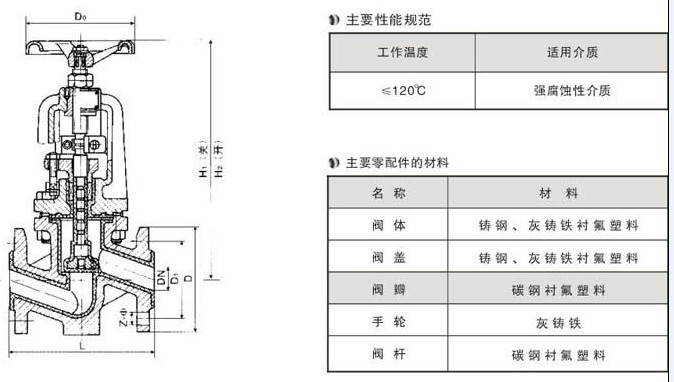 产品用途:衬胶截止阀是指关闭(阀瓣)由阀杆带动并沿阀座中心轴线做升降运动的阀门,在管路上主要用来接通或截断管路中的介质,但不能做节流用。 产品特点:本阀专用于控制一般腐蚀性介质,阀体内腔表面覆有可供选择的各种橡胶,适用于不同工作温度和流体管中,具有强度高、耐腐蚀性好的特点。 适用温度:≤85℃、≤100℃、≤120℃(按照衬里材料) J41J衬胶截止阀的详细资料: ◆结构图片